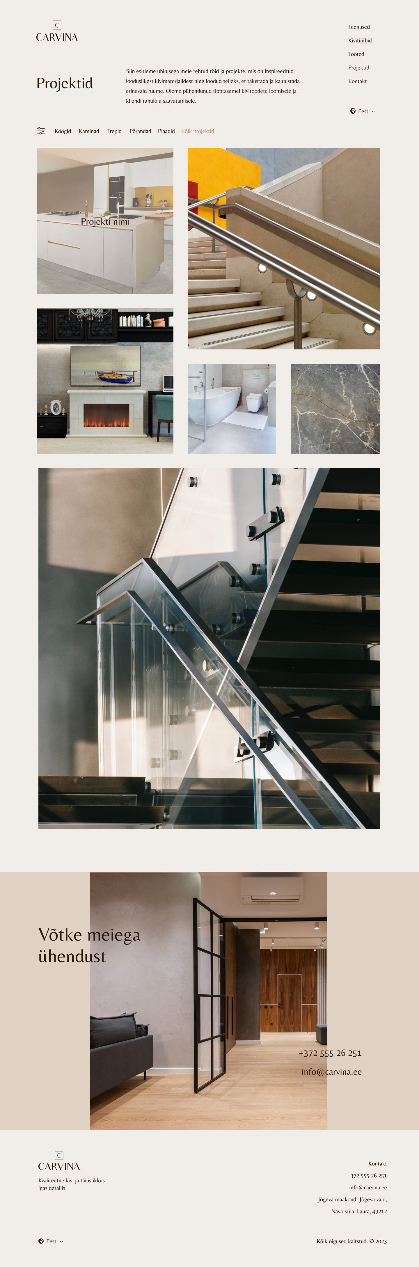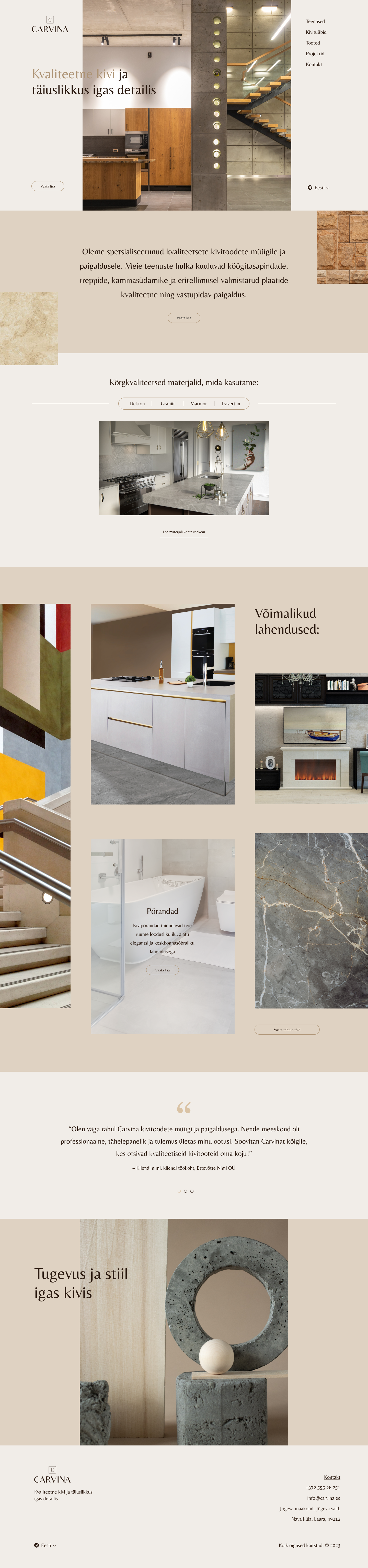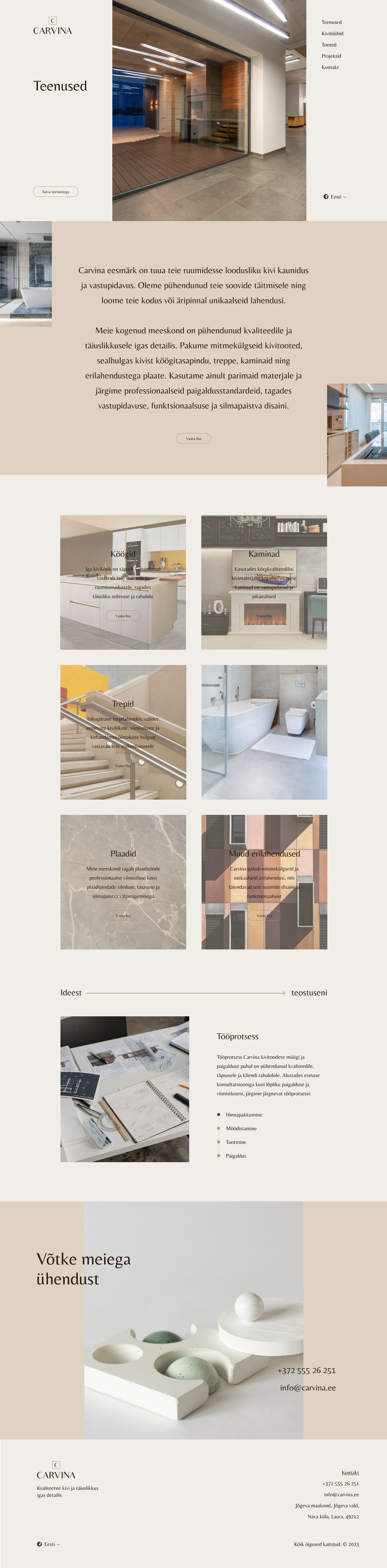 Carvina on ettevõte, mis pakub kivi paigaldamise teenuseid otse koju koos väga personaalse lähenemisega. Carvina eesmärk on tuua ruumidesse loodusliku kivi kaunidus ja vastupidavus. Nad on pühendunud erisoovide täitmisele ning loovad kodus või äripinnal unikaalseid lahendusi.