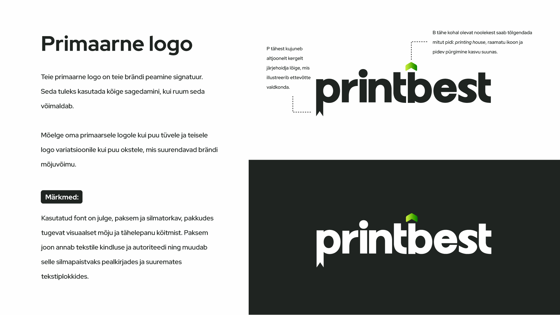 Lisaks lõime detailse brändiraamatu, mis sisaldab põhjalikku strateegiat, juhiseid logo, värvipaleti, tüpograafia ja muude visuaalsete elementide kasutamiseks. See tagab Print Besti brändi järjepidevuse kõikides turunduskanalites ning trükimaterjalides.
